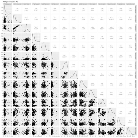 The echocardiographic parameters post-PCI and at the 12-month follow-up are shown in Table 3. Both groups had similar baseline echocardiographic results, except for the E/A ratio, which was significantly higher in the affected group (1.3 vs. 0.84, p < 0.001). Figure 2 shows the correlations between biomarkers, including TMAO levels at the baseline and 3 months, an increase from the baseline to 3 months, peak troponin, BNP, and hs-CRP, and the 12-month echocardiographic parameters, including LVEF, delta LVEF, LVEDV, E, E/A, E/e′, TRpV, and LAVI. The TMAO level at the baseline was not correlated with any 12-month echocardiographic parameters, while the 3-month TMAO and delta TMAO showed significant correlations with most 12-month echocardiographic parameters except for the 12-month LVEDV. The distribution of the 12-month echocardiographic parameters and quartiles of 3-month TMAO levels is shown in Table A1. Similarly, the 3-month BNP and hs-CRP demonstrated significant associations with most echocardiographic parameters, with the exceptions of the 12-month E/e′ ratio and LAVI for BNP and the 12-month LAVI and changes in LVEF and LVEDV for hs-CRP. In contrast, there were no significant associations between the peak troponin levels and echocardiographic parameters except for at 12 month.
