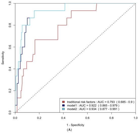 ROC curve analysis was employed to evaluate the diagnostic performance of traditional risk factors both alone and in combination with biomarkers. The AUC for traditional risk factors alone was 0.79 (95% CI: 0.69–0.90) for group 4 FLVR and 0.68 (95% CI: 0.58–0.77) for ≥grade II LVDD. The addition of hs-CRP and BNP increased the AUCs to 0.92 (95% CI: 0.87–0.98) and 0.69 (95% CI: 0.60–0.78) with p-values of 0.009 and 0.406, respectively. Incorporating all three biomarkers—TMAO, hs-CRP, and BNP—further enhanced the AUCs to 0.93 (95% CI: 0.88–0.99) and 0.75 (95% CI: 0.66–0.84), with p-values of 0.032 and 0.020, respectively (Figure 4A and Figure 4B). The NRI and IDI analysis showed that the addition of hs-CRP and BNP to traditional risk factors did not significantly improve the ability to predict group 4 FLVR and ≥grade II LVDD. However, the addition of TMAO, hs-CRP, and BNP to traditional risk factors significantly improved the prediction of ≥grade II LVDD, but not group 4 FLVR (Table A3).
