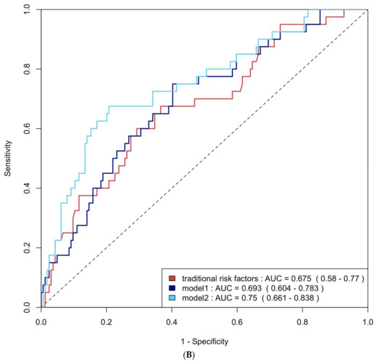(A) ROC curve analysis of predicting group 4 FLVR with traditional risk factors and models with biomarkers. (B) ROC curve analysis of predicting grade II or III DD with traditional risk factors and models with biomarkers. Traditional risk factors: age, gender, hypertension, diabetes, hyperlipidemia, and smoking. Model 1: traditional risk factors + hs-CRP and BNP level at 3 months, Model 2: Model 1 + 3 months of TMAO.