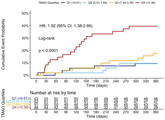 At the 12-month follow-up, MACCE occurred in 44 (20.95%) patients. The cumulative event curve showed an increased incidence of MACCE in the highest TMAO quartile (log-rank p < 0.001), starting in the first-month post-STEMI (Figure 5), and was driven predominantly by HF hospitalization (Figure A3). The 15 HF hospitalizations predominantly occurred in patients within the highest TMAO quartile, showing a bimodal distribution during the first month and again after three months (Figure A4).