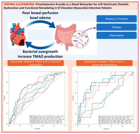 Trimethylamine N-oxide (TMAO) is a novel biomarker derived from gut microbe metabolites [9]. Prior research has demonstrated a correlation between elevated TMAO levels and HF and coronary artery disease (CAD) [10,11]. Recently, our TAMIR (Impact of TMAO Serum Levels on Hyperemic IMR in STEMI Patients) study (NCT05406297) showed that TMAO levels were associated with CMD after STEMI [12]. Thus, there is a potential pathophysiologic link between TMAO and post-STEMI HF. This study investigated TMAO as a biomarker for predicting FLVR or LVDD following STEMI.