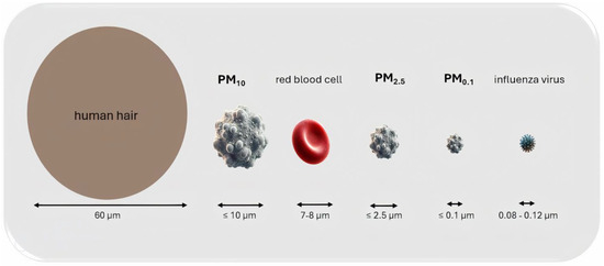 Particulate matter is a complex mixture of fine particles and liquid droplets containing organic compounds, acids, metals, soil, dust particles, or semi-volatile compounds. Due to their small size, they pose a serious threat to human health. They can be of natural origin (e.g., fires, volcanic eruptions, sandstorms, or sea salt aerosols) or anthropogenic (artificial), i.e., caused by human activity (e.g., industry, tobacco smoke, car exhaust emissions) [69]. Particle classification is based on the aerodynamic diameter. Among them, three primary groups are distinguished: PM10 (particles with a diameter of ≤10 μm), PM2.5 (particles with a diameter of ≤2.5 μm), and PM0.1, which is also called the ultrafine fraction of particulate matter (UFPM) and have an aerodynamic diameter ≤ 0.1 μm.