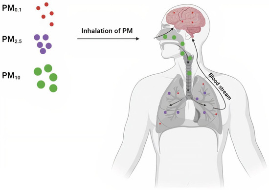 The main route of entry of PMs into the body is the respiratory tract. In this system, their fate depends on their size. For the most part, large PM10 particles are captured and removed in the upper respiratory tract with the help of an efficient mechanism of the mucociliary apparatus within the mucosa and the cough and sneeze reflex. In turn, in the lower sections of the respiratory tract, smaller pollutants are removed by phagocytosis or by pulmonary macrophages. Solid particles with a diameter of 2.5 μm and smaller get into the alveoli and then directly into the blood vessels, where they can pass through the blood–brain barrier to the brain (Figure 2) [74]. The smallest particles can enter the body through the nasal cavity via the olfactory epithelium or indirectly through the olfactory nerve, trigeminal nerve, and vagus nerve. They thus can spread to other regions, such as the cerebral cortex or cerebellum. Oberdörster et al. [75] concluded that UFPM reaches the brain via the olfactory nerves.