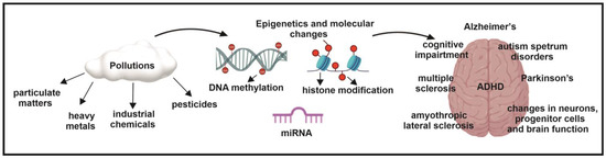 When analyzing the impact of environmental pollution on epigenetic changes, microRNAs (miRNAs) should be considered. These small non-coding RNAs regulate protein expression, and alterations in their profiles, or their loss due to deficiencies in Dicer or DGCR8, have been associated with cognitive decline and neurodegenerative diseases such as Alzheimer’s disease [232]. Exposure to PM, diesel exhaust particles, and carbon black nanoparticles has been shown to disrupt miRNA regulation [233,234].