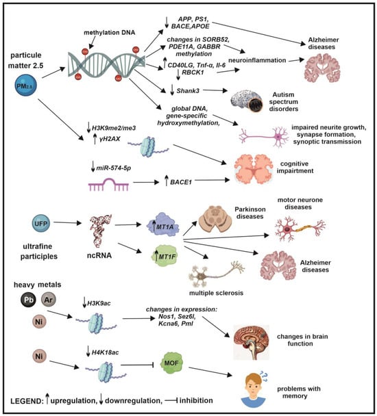 Air pollution significantly alters histone methylation, impacting brain function and contributing to neurodegenerative diseases. An in vivo study showed that chronic PM2.5 exposure leads to lower H3K9me2/me3 and higher γ-H2A.X levels in prefrontal white matter nuclei. Decreased H3K9me2/me3 can induce abnormal gene transcription, genomic instability, and DNA damage, resulting in cognitive impairment [228]. Additionally, γ-H2A.X is a marker of DNA double-strand breaks, and its elevated levels suggest potential DNA damage in individuals exposed to polluted air [229]. Exposure to ambient particulate matter, including ultrafine particles, is also associated with neurodevelopmental and neurodegenerative disorders. Recent studies have demonstrated that UFP exposure alters the expression of several non-coding RNAs, which regulates gene expression and fine-tunes cellular responses to environmental stimuli. This alteration may represent a protective mechanism against uncontrolled inflammatory processes, which are known to be neurotoxic. Specifically, UFP-induced changes in non-coding RNA expression might modulate the expression of neuroprotective metallothioneins (MT1A and MT1F) in neurons. Metallothioneins offer protection against aging and heavy metal-induced oxidative stress-related damage and cell death through their anti-inflammatory and antioxidant properties. However, sustained elevated MT1/MTII expression in the brain has been consistently linked to the onset and progression of neurodegenerative diseases such as Alzheimer’s, Parkinson’s, multiple sclerosis, and motor neuron disease [230,231] (Figure 5).