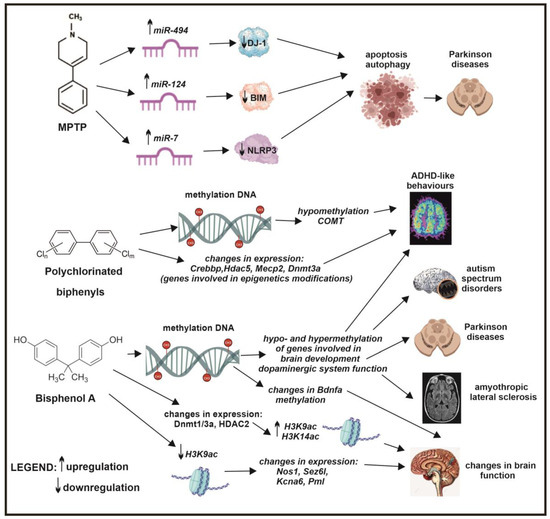 The impact of MTPT, PCBs, and BPA on epigenetic modifications and neurological disorders. MPTP can regulate the expression of specific microRNAs, including miR-494, miR-124, and miR-7, implicated in the pathogenesis of Parkinson’s disease. Polychlorinated biphenyls can alter DNA methylation at genes such as Crebbp, Hdac5, Mecp2, and Dnmt3a, potentially contributing to ADHD-like behaviors. Bisphenol A can influence DNA methylation at specific genes and disrupt histone H3 acetylation, potentially associated with the development of autism spectrum disorders, Parkinson’s disease, amyotrophic lateral sclerosis, and alterations in brain function.