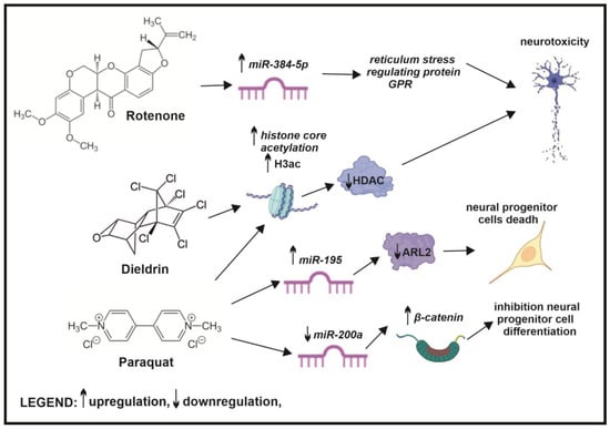 Pesticides, such as rotenone, paraquat, and methyl-phenyl-tetrahydropyridine (MPTP), constitute a major class of neurotoxicants linked to neurodegenerative diseases. Studies have suggested that pesticides can affect miRNA expression [237]. In neuroblastoma SH-SY5Y cells, the downregulation of miR-384-5p protects against rotenone-induced neurotoxicity by inhibiting the endoplasmic reticulum stress-regulating protein GPR-78 [237,238]. Other pesticides, like paraquat alone or in combination with Maneb (fungicide), can upregulate miR-195 expression, leading to the downregulation of ADP-ribosylation factors like protein-2 and inducing apoptosis in neural progenitor cells [239]. Additionally, paraquat downregulates miR-200a, inhibiting neural progenitor cell differentiation and increasing beta-catenin protein levels [240] (Figure 7).