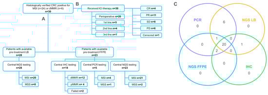 Study schema: (A) testing procedures; (B) treatment details; and (C) distribution of patients based on the different assays they received, showing how many patients were part of each assay group and how many received combinations of the assays. Patients with CRC were recruited based on the results of routine assessments of MSI/dMMR via gold-standard methods (IHC or PCR). Testing with an alternative gold-standard method (FFPE) and NGS (FFPE and/or LB) were performed centrally.
