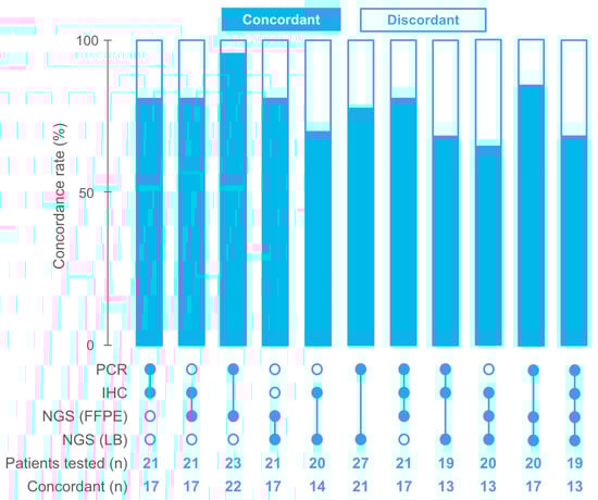 After combining the local and central testing results, in total, 29 (96.7% of all patients) patients had PCR results, and 22 (73.3%) patients had IHC results. A total of 23 (76.7%) and 28 (93.3%) had results of NGS testing of FFPE and LB samples, respectively (Figure 1). Concordance between local and central dMMR/MSI testing (i.e., concordance between IHC and PCR) was at 81%. Although all patients included in this study had MSI-positive tumors, as determined locally by gold-standard methods (IHC or PCR), only 91.3% of available FFPE and 71.4% of LB samples were MSI-positive based on NGS. Among all the methods evaluated, the highest concordance was observed between PCR and NGS (FFPE), with a concordance rate of 95.6%. The concordance of IHC with NGS was low, with concordance rates of 81% and 70% for NGS (FFPE) and NGS (LB), respectively. NGS-based estimation of MSI in FFPE and LB samples was concordant in 80.1% of the cases. The agreement of all methods was observed for 17 FFPE samples and 13 FFPE + LB paired samples. The concordance rate of all four methods was 68.4% (Fleiss’s k = 0.2, indicating a slight agreement) (Figure 2).