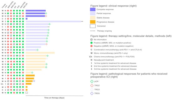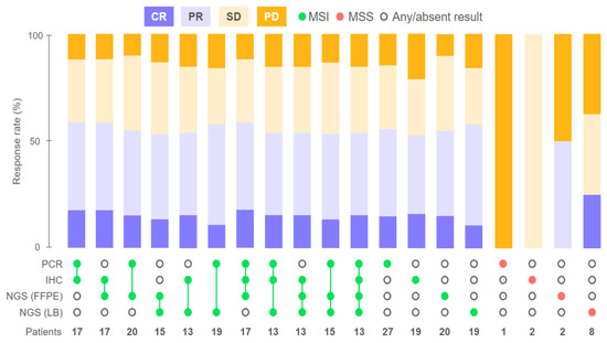 Intriguingly, objective responses were observed in 50% (1/2 PR) and 25% (2/8 CR) of patients with no MSI (i.e., microsatellite stability (MSS)) detected by NGS in FFPE and LB samples, respectively. Both patients with MSS LB who exhibited CR received preoperative ICI. One of these patients with dMMR/MSI based on IHC, PCR, and NGS (FFPE) had a BRAF p.V600E mutation identified in FFPE, but the latter was undetectable in LB, which could indicate a potentially low ctDNA fraction contributing to the MSS result. Another patient with MSS LB demonstrating a CR had a MSI-positive PCR result of local testing (central IHC and NGS (FFPE) were not performed due to the unavailability of FFPE). A patient who had a PR to preoperative ICI but had a MSS result following FFPE analysis based on NGS had low tumor purity, potentially causing a false-negative result since both PCR and LB analyses confirmed the MSI status (the patient’s FFPE sample also had an insufficient tumor cell content for IHC) (Figure 3 and Figure 4).