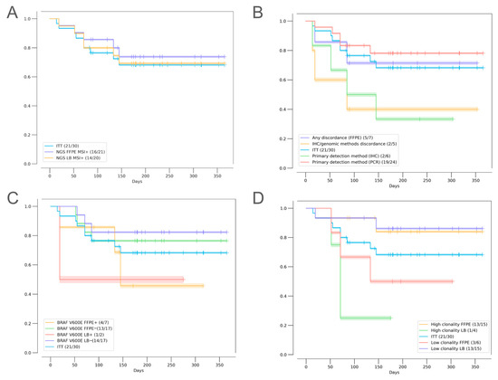 Kaplan–Meier estimates of progression-free survival in patients based on (A) MSI positivity in FFPE and LB (NGS); (B) discordant MSI/dMMR results and the primary method used for MSI/dMMR testing; (C) BRAF mutations found in FFPE and/or LB; and (D) MSI clonality values in FFPE and LB.
