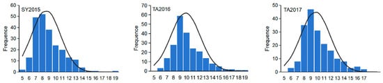 Frequency distribution of husk number. SY2015: Sanya in 2015; TA2016: Taian in 2016; TA2017: Taian in 2017.