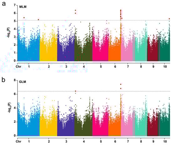 Manhattan plot for genome-wide association analysis of husk number. The SNPs are represented by dots. The horizontal dashed line represents the −log10(P) > 5.12 (P < 7.6 × 10−6) (a) and −log10(P) > 6.42 (P < 3.8 × 10−7) (b) significant thresholds, respectively. Red dots above the dashed line indicated SNPs significantly associated with husk number. MLM: mixed linear model; GLM: general linear model.