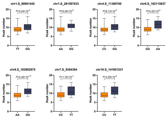 In this study, SNP alleles with a lower HN were defined as favorable alleles, whereas those with a higher HN were defined as unfavorable alleles. The allelic effects of different haplotypes of each significant SNPs on the HN trait were analyzed (Figure 3). The average HN for allele T of chr1.S_88001442 was 9.16, which was significantly smaller than that for allele C (10.39, p ≤ 0.001). Similarly, other favorable alleles for the HN included allele A of chr1.S_281597633, allele C of chr4.S_11389760, allele G of chr6.S_162115837, allele A of chr6.S_162882875, allele C of chr7.S_9364384, and allele C of chr10.S_141001231. The HN for lines carrying these alleles was 1.85, 1.50, 2.56, 2.08, 1.89, and 2.28 lower than those carrying unfavorable alleles, respectively.