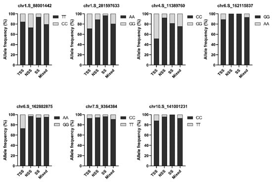 Allele frequency of SNPs significantly associated with husk number in different subpopulations. Dark-colored columns represent less-HN allele, and light-colored columns represent high-HN allele. TST, tropical/subtropical; SS, stiff-stalk; NSS, non-stiff-stalk; Mixed, the remaining inbred lines being Mixed subpopulation.
