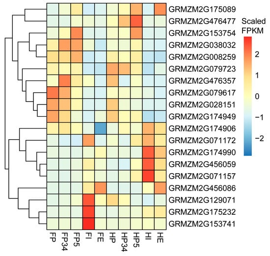 Heat-map of expression levels of the candidate genes identified by GWAS. The expression data are from leaf and husk leaf, and the description of the tissue is detailed in the study of Wang et al. []. Foliar primordia (FP), Foliar immature (FI), and foliar expanded (FE) leaf blades; husk primordia (HP), the outermost leaf on the ear (HE), and the third leaf in from the outside (HI). The color scale represents scaled FPKM values normalized using the z-score approach.