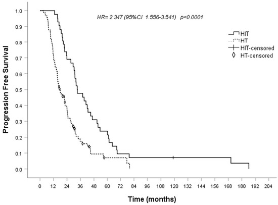 Progression-free survival correlated to hormonal therapy (survival median time of HIT 33.1 (95% CI 24.5–41.8); survival median time of HT 18 (95% CI 12.1–23.8)). HIT: hormone immunotherapy; HT: hormone therapy. Reproduced with permission by Nicolini A., et al. J. Cancer Metastasis Treat. 2022 8, 13 [190].
