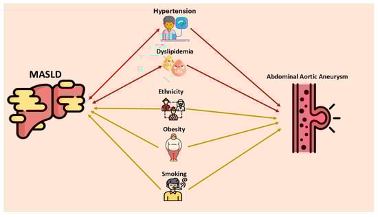 Shared risk factors between MASLD and abdominal aortic aneurysm (AAA) and their complex associations. Arterial hypertension and dyslipidemia are bidirectionally linked to MASLD and also increase the risk of AAA (red double-headed arrow). Ethnicity, smoking, and obesity are unidirectionally associated with both MASLD and AAA (gold single-headed arrow). MASLD—metabolic dysfunction-associated steatotic liver disease.