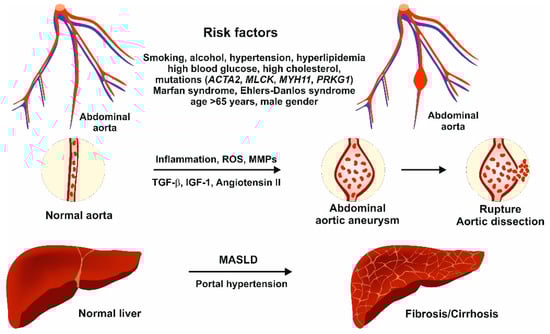 AAA and liver fibrosis may appear as distinct clinical entities, each primarily affecting a different organ system. However, growing evidence suggests that these conditions share several key pathogenic features, including chronic inflammation, oxidative stress, and aberrant extracellular matrix remodeling, all of which accelerate tissue damage and disease progression. This section describes the molecular pathomechanisms of AAA and how these processes intersect with fibrogenic pathways in the liver, offering insights into potential common therapeutic targets and highlighting the need for interdisciplinary research on these complex and often interconnected disorders. The precise pathomechanism of AAA is not fully understood yet, but it is clear that AAA is a condition that is triggered by inflammation, oxidative stress, different soluble mediators, genetic factors, and more. The contribution of these factors will be discussed in the following.