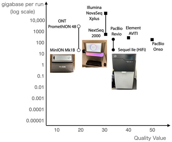 Next-generation sequencers in use in 2025. The horizontal axis shows the quality value, and the vertical axis shows the number of bases per run.