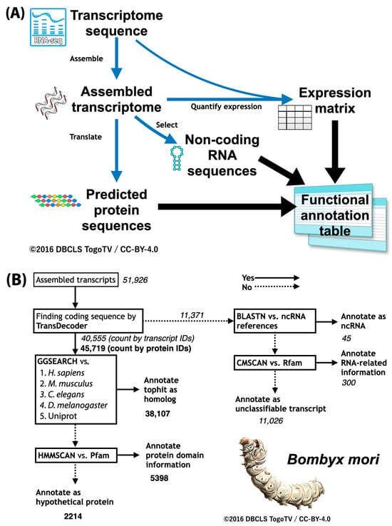 To carry out functional annotation, the first step is to predict the protein-coding sequences (abbreviated as coding sequence, and often called CDS) in the gene sequence and obtain their amino acid sequences [,,]. The predicted protein sequences are then used to perform sequence homology searches on protein sequence sets of other species. Here we can introduce a functional annotation workflow (Fanflow), which is the method used initially for insects [,]. Fanflow first performs functional annotation using sequence similarity search and protein domain search for all protein sequences translated from cDNA sequences obtained by transcriptome analysis (Figure 4A). Annotation of non-coding RNA sequences obtained at the same time is also attempted using sequence similarity search and RNA domain search. Furthermore, the expression level information obtained from transcriptome analysis is integrated and used as functional annotation information. Using this workflow, have we performed functional annotation on sequences obtained from stick insect and silkworm transcriptomes and have obtained richer functional annotation information than previous studies on silkworms (Figure 4B) []. The suite of programs developed for this purpose are available as open source software on GitHub (https://github.com/bonohu/SAQE (accessed on 1 April 2025)).