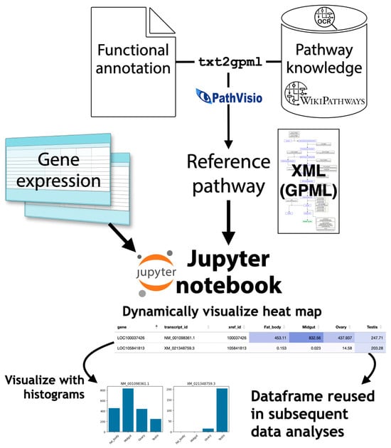 As a result, once the target pathway is known, a custom pathway diagram can be created by adding to the existing pathway diagram and placing genes in it; the expression profiles of the gene clusters belonging to it can then be viewed individually. For this purpose, the WikiPathways (https://www.wikipathways.org (accessed on 1 April 2025)) system, which allows pathway data to be shared like Wikipedia articles, can be used []. By publishing the new pathway diagrams created by the author, public web tools will be available and various data analyses can be performed using them. A system that facilitates the analysis of customized pathway diagrams using the WikiPathways platform, called Quest for Pathways with eXpression (QPX), has been developed to perform pathway analyses on non-model organisms (Figure 5) [,].