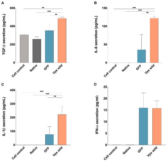 HIV-2 Vpx effect on the secretion of proinflammatory cytokines and type I interferons. Secretion of (A) transforming growth factor TGF-β (TGFβ), (B) Interleukin-6 (IL-6) and (C) Interleukin-1 beta (IL-1β) and (D) type I α interferons determined from the supernatant of Vpx-transfected cells, 24 h after transfection. Columns represent the mean values of two independent experiments, and error bars represent the ± SD of these experiments. ** p < 0.01; *** p < 0.001.
