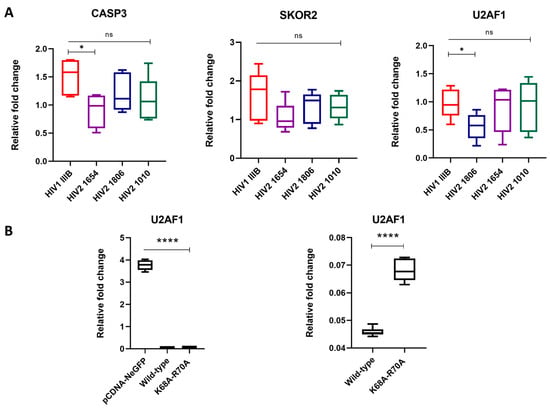 In regard to experiments using replication-competent virions, a significant reduction in U2AF1 expression was observed in cells infected with the HIV-2 1806 isolate (* p < 0.05), while CASP3 expression showed a significant downregulation after infection with the HIV-2 1654 isolate (* p < 0.05); however, the expression of SKOR2 remained unaffected across all HIV-2 primary isolates.