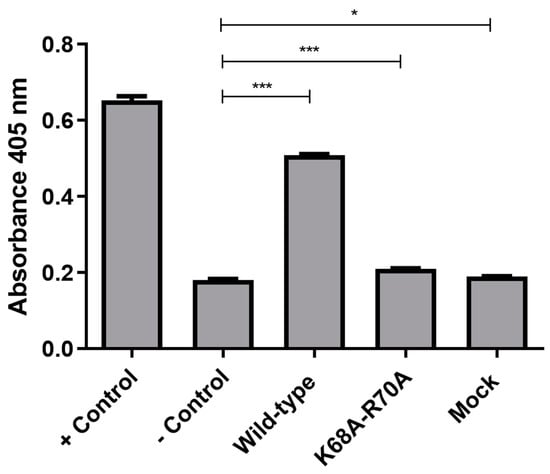 Assessment of CASP3 activity in transfected cells. CASP3 activity is shown in cells transfected with pcDNA3.1-Vpx-NeGFP (wild-type), pcDNA3.1-MutVpx-NeGFP (K68A-R70A mutant) and pcDNA3.1-NeGFP (mock) plasmids. Non-transfected THP-1 cells were used as negative controls (− Control), while cells treated with 1 µM staurosporine were used as positive controls (+ Control). An unpaired t-test was used to calculate statistical significance. * p-value ≤ 0.05; *** p-value ≤ 0.001. The experiment was carried out in triplicates.