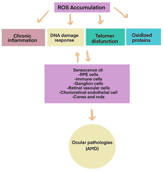 There is a known association between aging and chronic inflammation, leading to the concept of immunoaging. This term describes a persistent inflammatory state characterized by increased levels of cytokines and chemokines in tissues. This process is a natural part of aging and is crucial in immunosenescence, particularly in age-related pathologies such as age-related macular degeneration (AMD). Inflammation affects both adaptive and innate immune cells. For example, in macrophages, there is a reduction in phagocytic activity, which increases pro-inflammatory mediators in the retina and choroid [28]. Senescence damage is illustrated in Figure 4.