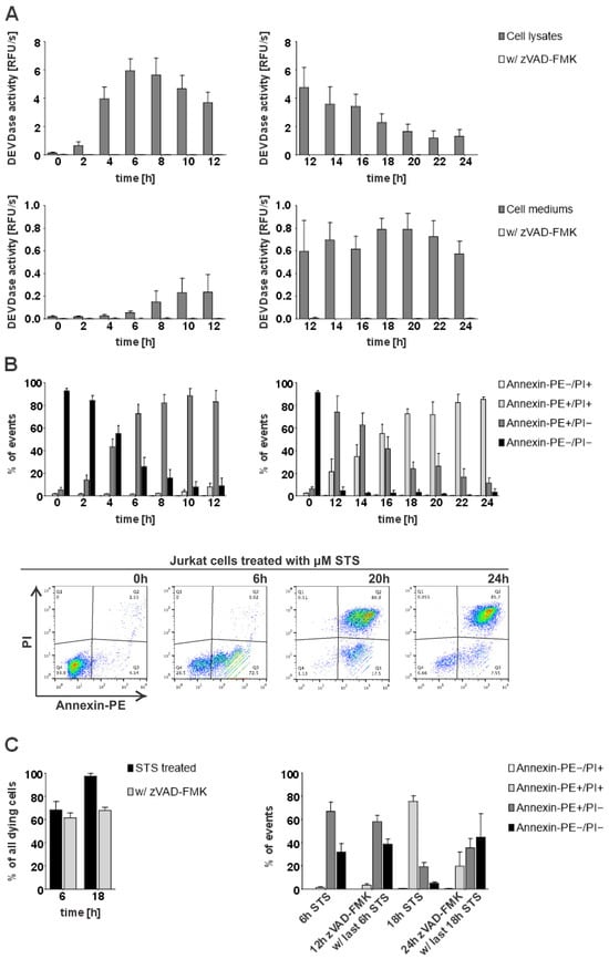Detection of intracellular and extracellular caspase activity and flow cytometry analysis of STS-triggered apoptosis in Jurkat E6.1 cells. For all time-course experiments, Jurkat E6.1 cells were treated with 0.5 µM staurosporine (STS) or additionally with 25 µM zVAD-FMK. (A) DEVDase activity in lysates and cell media following STS treatment. Results are shown for 4 repeated experiments (n = 4) in technical triplicates (n = 3). (B) Statistical analysis of flow cytometry measurements depicting the percent of either viable (Annexin-PE−/PI−), early apoptotic (Annexin-PE+/PI−), late apoptotic or secondary necrotic (Annexin-PE+/PI+) or necrotic cells (Annexin-PE−/PI+) detected during four separate experiments (n = 4) and density diagrams of Annexin-PE positive cells (FL1-Height) against PI-positive cells (FL3-Height) present at the representative time points—viable cells (0 h), early apoptosis (6 h), secondary necrosis (20 h) and at the end of the experiment (24 h). (C) Cumulative percentages of detected dying cells (either Annexin-PE+/PI−, Annexin-PE−/PI+, or Annexin-PE+/PI+) and analysis of detected stained cells at representative time points for early (6 h) and late apoptosis (18 h) after treatment (n = 2). The data are shown as means ± SD.