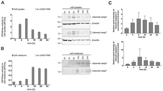 Enzymatic activity and immunological detection of caspases-3 and -7 in lysates and cell media of apoptotic Jurkat E6.1 cells. For all time-course experiments, Jurkat E6.1 cells were treated with 0.5 µM staurosporine (STS). (A) DEVDase activity in lysates and corresponding Western blot detection of cleaved caspases-3 and -7. For Western blot detection, β-actin was used as a loading control. (B) DEVDase activity in cell media and the corresponding Western blot detection of cleaved caspases-3 and -7. (C) Quantification of detected caspases in cell lysates presented as relative intensity of bands normalized to loading control. Three (n = 3) independent repetitions were used to calculate the relative intensity of bands. Kinetic measurements were performed in triplicates (n = 3). Data are presented as means ± SD.