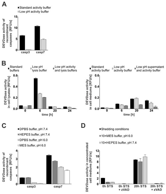 Enzymatic activity of caspases-3 and -7 in a normal (pH 7.4) and acidic (pH 6.0) environment. For DEVDase activity detection, either recombinant caspases (10 nM) were used (A,C) or apoptosis was induced with STS in Jurkat E6.1 cells and activity was detected in lysates (B) and media (D). All activity measurements were performed using 20 μM Ac-DEVD-AFC as a substrate (2000:1 ratio) when recombinant caspases were used (A,C). Jurkat E6.1 cells were treated with 0.5 µM STS at indicated time points. All experiments were performed as technical triplicates (n = 3) and data are presented as means ± SD. (A) DEVDase activity of recombinant caspases-3 and -7 in standard (HEPES buffer, pH 7.4) and low-pH (MES buffer, pH 6.0) activity buffer. (B) Detection of DEVDase activity in lysates and cell media of STS-treated Jurkat E6.1 cells in normal (pH 7.4) and acidic (pH 6.0) conditions. (C) Analysis of DEVDase activity of recombinant caspases-3 and -7 in different buffers (DPBS, HEPES, MES) under normal (pH 7.4) and acidic pH (pH 6.0). (D) Detected DEVDase activity in concentrated media from untreated (0 h STS) and secondary necrotic (20 h STS) Jurkat E6.1 cells under shedding conditions.