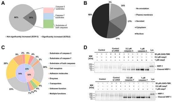 Identification of potential extracellular targets of caspases-3 and -7 and validation of neuropilin-1 cleavage. (A) Percentage of identified proteins with significantly increased presence (SCR ≥ 3) of MDA-MB-231 cells in sheddomes upon treatment with both caspases. (B) Localization of identified proteins with SCR ≥ 3. (C) Division of identified substrates among unique substrates of each investigated caspase and shared substrates, and further division according to the molecular function of identified substrates. (D) Validation of caspase-mediated cleavage of the extracellular domain of NRP-1 by caspases-3 and -7 using immunological detection. The experiment was performed in triplicate, but only one experiment is shown.
