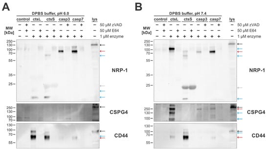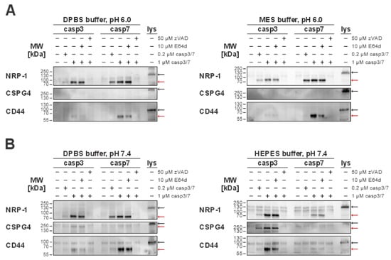 Immunological detection of caspase-mediated cleavages of extracellular proteins in normal (pH 7.4) and acidic (pH 6.0) environments. For the detection of extracellular cleavages, MDA-MB-231 cells were used. Red arrows indicate bands representing cleaved fragments, while black arrows indicate full-length proteins present in total cell lysates. (A) Detected caspase-3 or -7 extracellular cleavages of the selected targets (NRP-1, CD44, CSPG4) in an acidic (pH 6.0) environment in either DPBS or MES buffer. (B) Detection of caspase extracellular cleavages in a normal (pH 7.4) environment using either DPBS or HEPES buffer. NRP-1, neuropilin-1; CD44, CD44 antigen; CSPG4, chondroitin sulfate proteoglycan 4.
