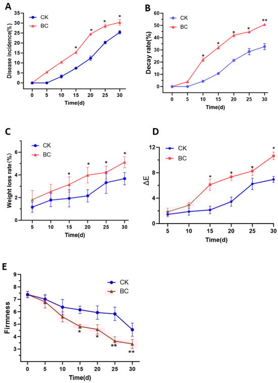 Effects of B. cinerea on (A) disease incidence, (B) decay rate, (C) weight loss rate, (D) rot rate, and (E) firmness in ‘Munage’ grapes. * Denotes significance at p < 0.05; ** denotes significance at p < 0.01.