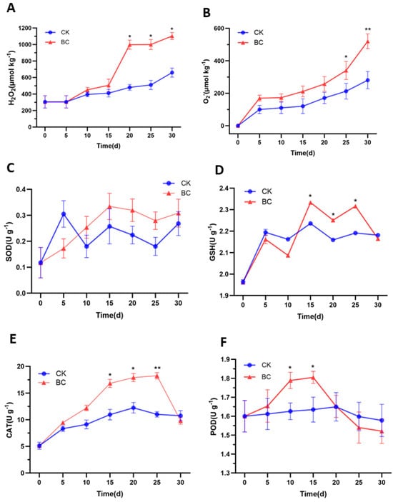 H2O2 content and O2− production rate exhibited synchronous trends (Figure 2A,B), and H2O2 and O2− levels in the BC group were significantly higher than those in the CK group after 20 and 25 days of storage (p < 0.05). The superoxide dismutase (SOD) and glutathione (GSH) activities first increased and then declined (Figure 2C,D). In the BC group, SOD activity increased from day 10 onward, though no significant difference among CK was observed. In contrast, GSH activity in the BC group surged significantly at days 15, 20, and 25 (p < 0.05) before dropping to CK levels at 30 d. Figure 2E showed that the catalase (CAT) activity in the BC group demonstrated a sustained upward trend, peaking at 15 and 25 d post-inoculation with significant elevation compared to the CK group (p < 0.05) before declining slightly. In Figure 2F, peroxidase (POD) activity in the BC group significantly decreased at 10 and 15 d (p < 0.05), while the CK group maintained stability.