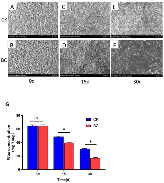 Effects of B. cinerea on waxy structure and amount in ‘Munage’ grapes. (A–F) Waxy structure of CK and BC groups was observed using SEM (×1000 magnification); (G) changes in wax amount after infection with B. cinerea. * denotes significance at p < 0.05, ns denotes no significant difference.