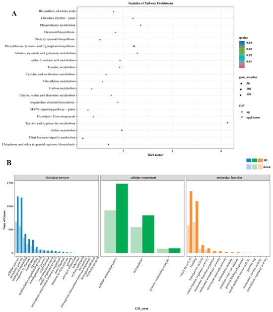 Kyoto Encyclopedia of Genes and Genomes (KEGG) and Gene Ontology (GO) in CK15_VS_BC15. (A) Enrichment of KEGG. (B) Enrichment of GO.