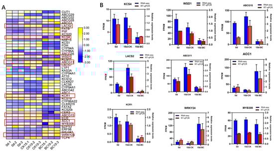 The 431 DEGs analyzed by KEGG enrichment are shown in Figure 5A. According to the KEGG metabolic pathway and differential gene expression analysis, this study found 24 key DEGs involved in the synthesis of 13 and extension of 11 fatty acids from the CK15_vs_BC15 group (Table 1). The genes of long-chain acyl-CoA synthase (LACS), 3-ketoacyl-CoA synthase (KCS), and acetyl-CoA carboxylase (ACC) were mainly enriched in the KEGG pathway of fatty acid synthesis, in which KCS20, LACS6, and ACC1 were up-regulated, while ECR and LACS7 were down-regulated. Additionally, 14 DEGs were involved in the synthesis of cuticle and wax, mainly the ultra-long chain aldehyde decarbonylase (CER3), alkane hydroxylase (MAH1), O-acyltransferase (WSD1), and cytopigment (CYP94A1). MAH1 and WSD1 were down-regulated, while CER3 and CYP94A1 were up-regulated. Furthermore, 11 DEGs were involved in wax transport, mainly non-specific lipid transfer proteins (LTPG1, LTP1) and the G subfamily of ABC transporters (ABCG). LTPG1 was down-regulated, LTP1 was up-regulated, and most ABCGs were up-regulated.