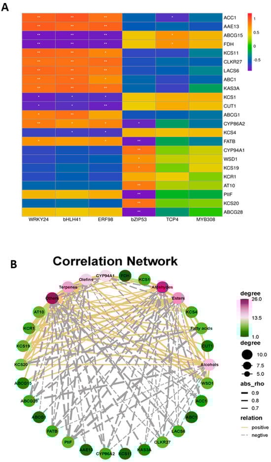 Correlation analysis between TFs, waxy components, and waxy-related DEGs. (A) The relationship between TFs and waxy-related DEGs. (B) The relationship between waxy components and waxy-related DEGs. * and ** denote significance at p < 0.05, p < 0.01.