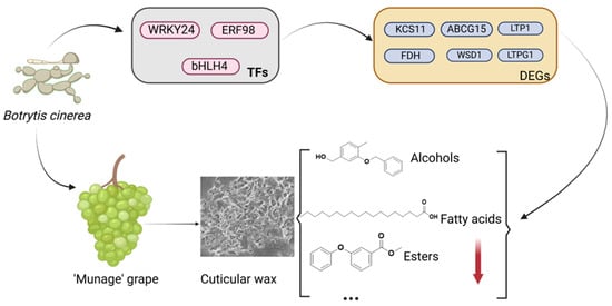 As shown in Figure 7A, the gene relating to fatty acid elongation, FDH, was negatively correlated with WRKY24, bHLH4, and ERF98, while KCS11 was positively correlated with WRKY24, bHLH4, and ERF98. The genes relating to fatty acid synthesis, CLKR27, LACS6, AAE13, and ACC1, had a strong positive relationship with WRKY24, bHLH4, and ERF98. To clarify, the transcription factors played a vital role in B. cinerea-inoculated grapes, and we further explored the relationship between transcription factors and genes related to wax synthesis. The associations between the wax components and genes associated with wax transport altered by B. cinerea were determined by PLS correlation analysis (Figure 7B). The abundance of aldehydes, esters, alcohols, terpenes, and other wax components, including fatty acids and olefins, had high correlations with the genes involved in wax synthesis. The potential molecular mechanisms underlying B. cinerea-induced wax metabolic reprogramming in ‘Munage’ grapes are illustrated in Figure 8. The schematic diagram depicts a regulatory cascade where B. cinerea infection triggers differential expression of TFs, including WRKY24, bHLH4, and ERF98. These TFs subsequently modulate key wax biosynthesis-related genes, including KCS11, ABCG15, LTP1, FDH, WSD1, and LTPG1. This transcriptional regulation ultimately disrupts the wax biosynthetic pathway and changes the composition of the ‘Munage’ grapes’ epicuticular wax.