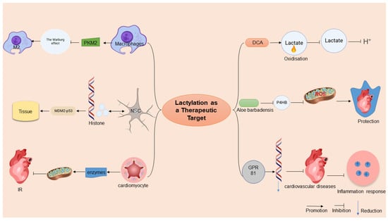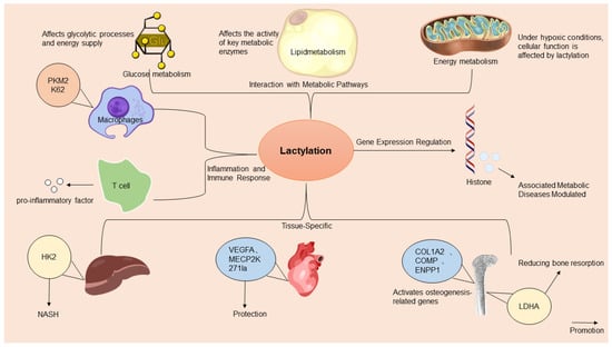 The pathological implications of lactylation are evident in metabolic diseases. Abnormal lactylation in key proteins related to metabolic disorders may lead to the dysregulation of metabolic pathways and exacerbate the progression of metabolic diseases. For example, in certain cases of diabetes, the aberrant lactylation of specific proteins might contribute to the development of diabetic complications by affecting glucose metabolism and insulin signaling. Conversely, histone lactylation (e.g., VEGFA) and macrophage regulation help to establish immunity homeostasis and activate the cardiac repair process in a timely manner []. These contrasting pathophysiological roles underscore the context-dependent nature of lactylation signaling.