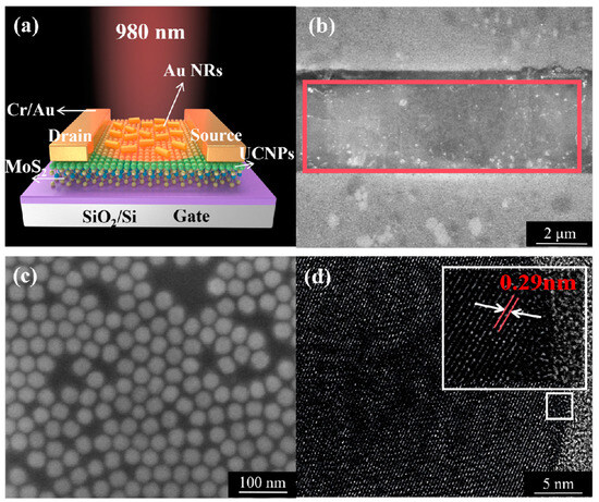Figure 1a depicts a schematic of the Au NRs/UCNPs/MoS2 hybrid device. First, a dispersion of UCNPs (NaYF4:Yb3+/Er3+) in cyclohexane was spin-coated onto monolayer MoS2 on a Si substrate with a 300 nm SiO2 layer. The Au NR solution was then dropped onto the UCNPs/MoS2 hybrid device and allowed to dry. A scanning electron microscopy (SEM) image of the Au NRs/UCNPs/MoS2 hybrid device is presented in Figure 1b, displaying MoS2 in the middle of the electrode (dashed line), a large number of uniformly sized UCNPs scattered on the surface of the MoS2 flake underneath, and the dispersed distribution of Au NRs. As shown in Figure S3a, elemental analysis was performed on samples within the red area, and Si elements in the base were removed. Figure S3c presents the elemental proportions in the red area, revealing Mo and S elements belonging to MoS2; Na, Y, F, Yb, and Er elements belonging to UCNPs, the O element belonging to the SiO2 substrate; and the Au element belonging to Au NRs. Figure 1c illustrates the uniform distribution of UCNPs on the sample after spin-coating. The atomic force microscopy (AFM) data (Figure S5) indicated that the UCNP film comprised single or double layers. Figure 1d displays the atomic lattice fringes of UCNPs captured by transmission electron microscopy (TEM), revealing a lattice spacing of approximately 0.29 nm, which corresponded to the hexagonal crystal phase, as previously reported [36]. According to the statistical results shown in Figure S4, the UCNP diameter was approximately 43 nm. Au NR morphology was characterized by TEM, as shown in Figure S2a,b, which displays the atomic lattice fringes of Au NRs, revealing a lattice spacing of approximately 0.21 nm. According to the statistical results shown in Figure S2c,d, the Au NR length and cross-sectional diameter were approximately 143 and 26 nm, respectively, with a 1:6 particle size ratio.