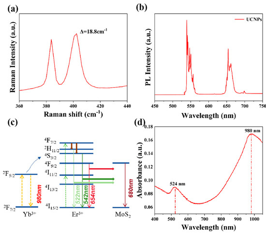 (a) Raman spectrum of bare MoS2 on SiO2/Si, demonstrating the E2g and A1g peaks of MoS2. (b) PL spectrum of UCNPs with 980 nm excitation (P = 475 W/cm2). (c) Schematic of the excitation of electrons and energy transfer from UCNPs to MoS2 in the hybrid device. (d) Absorption spectrum of Au NRs in an aqueous solution.