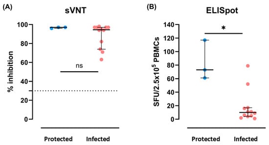 Comparison of baseline SARS-CoV-2-specific neutralization (A) and IFN-γ production (B) among study participants. Blue dots represent an individual’s assay results from the subjects in the Protected group, whereas red dots represent the results from the Infected group. Horizontal bars indicate the median, and error bars represent interquartile ranges. The horizontal dotted line indicates the suggested assay cut-off in A. p values were calculated using the Mann–Whitney U test, showing a non-significant difference in sVNT and significantly greater IFN-γ production in the Protected group (p = 0.0208). ns, not significant; * p < 0.05.