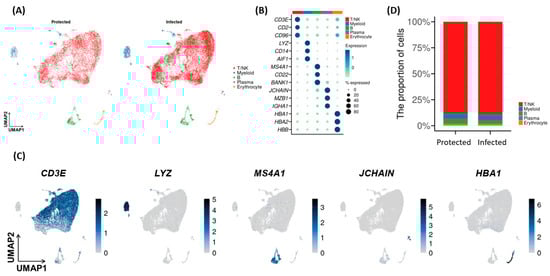 scRNA-seq was employed to examine the transcriptomic characteristics induced by the vaccine. The scRNA-seq data statistics are summarized in Supplementary Table S1 and Supplementary Figure S1. Following the acquisition of data from individual samples, subsequent analyses were conducted on pooled samples according to the group definition. After quality control, a total of 30,208 cells were obtained, with 11,494 from the Protected group and 18,714 from the Infected group. UMAP visualization of total single cells showed similar gene expression patterns between the Protected and the Infected groups (Figure 2A). Based on the distinct expression levels of canonical marker genes (Supplementary Data S1), we identified five immune cell subtypes: “T/NK”, “Myeloid”, “B”, “Plasma”, and “Erythrocyte” (Figure 2B,C). The distribution of these clusters and the proportions of these five immune cell subtypes did not differ between the Protected and the Infected groups (Figure 2D). We then conducted further clustering for three cell types: T/NK cells, myeloid cells, and B cells.