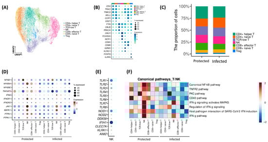 Through additional clustering, we identified six T cell subpopulations (CD4+ helper T, CD4+ naïve T, TCR-low T, CD8+ effector T, CD8+ naïve T, Treg) and one NK cell population from the “T/NK” cluster (Figure 3A,B). The proportion of these seven subpopulations showed no significant difference between the Protected and the Infected (Figure 3C). However, the analysis of gene expression in each subcluster revealed that not only were IFN-γ-related upregulated but several other important genes involved in signaling pathways were also upregulated in NK cells in both groups, with a greater degree in the Protected group. The Protected group also showed greater expression of the TNFAIP3 gene in all T/NK subsets, which may play a role in cytokine-mediated immune and inflammatory responses (Figure 3D). While NK cells are traditionally associated with recognizing stress signals and abnormal host cells, they also express receptors that can recognize pathogen-associated molecular patterns (PAMPs), which are conserved molecular motifs found in pathogens. Key receptors involved in inflammatory pathways and PAMP recognition in NK cells include Toll-like receptors (TLRs), NOD-like receptors (NLRs), RIG-I-like receptors (RLRs), and c-type lectin-like receptors (CLRs). Among these receptors, our analysis revealed that IFIH1 showed the highest expression levels in the NK cell population (Figure 3E).