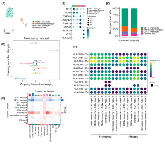 Myeloid cells were divided into four subpopulations: CD14+ monocytes, CD16+ monocytes, intermediate monocytes, and dendritic cells (Figure 4A,B). The Infected group exhibited a higher proportion of CD14+ monocytes and a lower proportion of CD16+ monocytes compared to the Protected group (p = 0.003, Figure 4C). However, considering the highly variable numbers of monocytes within the Infected group, we cannot conclude that this trend is a meaningful observation. Although the percentages of immune cells did not show remarkable differences, cell–cell interaction analysis revealed that cellular interactions through CD16 decreased in the Infected group, while interactions through dendritic cells increased (Figure 4D,E). In particular, the analysis of interactions mediated by MHC molecules showed downregulated interactions via certain MHC class II molecules with CD4+ naïve and CD4+ helper T cells (Figure 4F). Specifically, the interactions via HLA-DQA2 between CD14+ monocytes and CD4+ T cells were downregulated, similar to interactions via HLA-DQB between dendritic cells and CD4+ T cells.