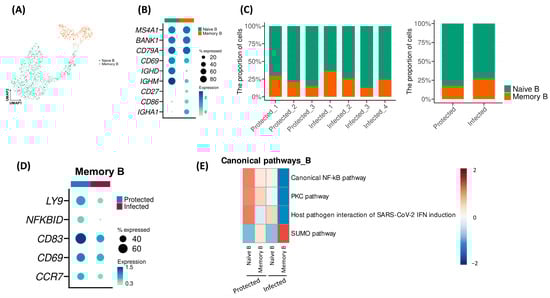 Further analysis of the B cells revealed two distinct subpopulations: naïve and memory B cells (Figure 5A,B). The proportion of memory B cells was significantly higher in the Infected group compared to the Protected group (p < 0.001, Figure 5C). Subsequently, we examined the molecular characteristics of memory B cells by comparing the DEGs between the Protected and the Infected subjects. Remarkably, the Infected subjects showed downregulation of several genes that are crucial for immune cell regulation, including LY9, CD83, and CD69, which are associated with lymphocyte differentiation and activation, as well as CCR7, a key chemokine receptor, and NFKBID, a gene encoding an NF-κB inhibitor (Figure 5D). Collectively, these findings suggest that the Infected subjects have a reduced capacity for lymphocyte regulation at baseline, which may contribute to their increased susceptibility when encountering the target pathogen. Pathway analysis revealed that inflammatory pathways were downregulated in the Infected group compared to the Protected group (Figure 5E), while the small ubiquitin-related modifier (SUMO) pathway was more enriched in the Infected group.
